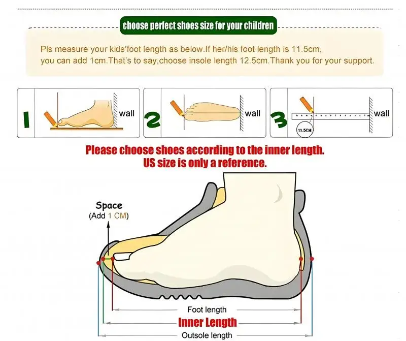 Note: It is recommended that the inner length of the shoes be equal to the baby's foot length plus about 1 centimeter (if the feet are overweight or the instep is high, increase by one size)